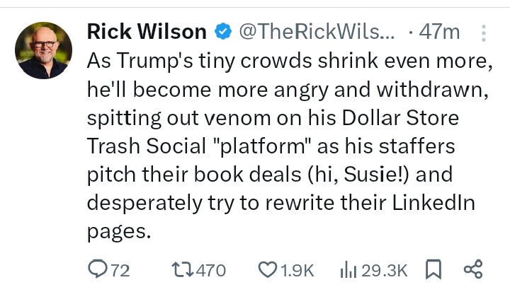 The term “Dollar Store Trash Social ‘platform'” is a derisive reference to Truth Social, Trump’s own social media venture created as a reaction to his bans from mainstream platforms. Wilson’s mention of Trump’s staffers pitching book deals and updating their LinkedIn profiles adds a personal touch to his critique, hinting that even those within Trump’s circle are preparing for the possibility of his political decline. The casual nod to “Susie” implies an insider’s familiarity, adding a layer of pointedness to the jab.