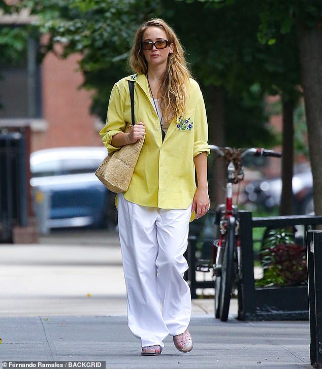Lawrence styled her jelly sandals with a chic ensemble: loose-fitting white trousers paired with a matching scoop neck tank top. She added a touch of vibrancy with a bright yellow button-up blouse featuring floral embroidery on the front pocket. Complementing her outfit, Jennifer’s long golden blonde hair cascaded in wavy strands down her back. She opted for a natural look with minimal makeup and shielded her blue eyes behind stylish sunglasses.