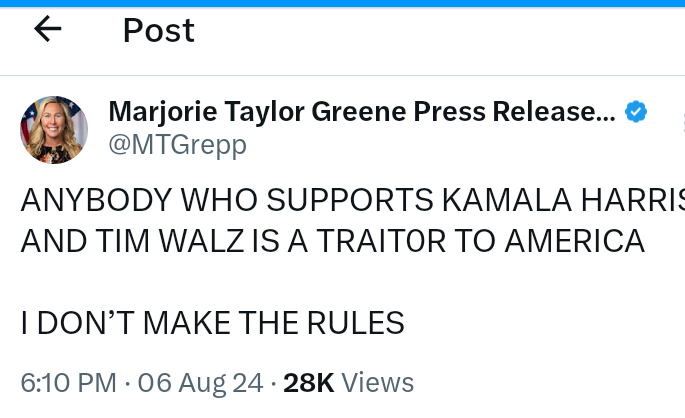 Rep. Marjorie Taylor Greene, R-Ga., has ignited a firestorm of controversy with a provocative tweet targeting the newly announced Democratic presidential ticket. On August 6, 2024, Greene took to X (formerly Twitter) to declare, “Anybody Who Supports Kamala Harris And Tim Walz is A Traitor To America. I don’t make the rules.”