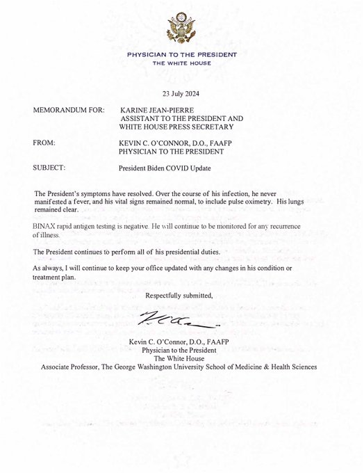 Dr. O’Connor stated, “President Biden’s COVID symptoms have resolved. He continues to perform all of his presidential duties without any interruption.” This reassuring news comes as a relief to the nation, considering the importance of stable leadership during these challenging times.